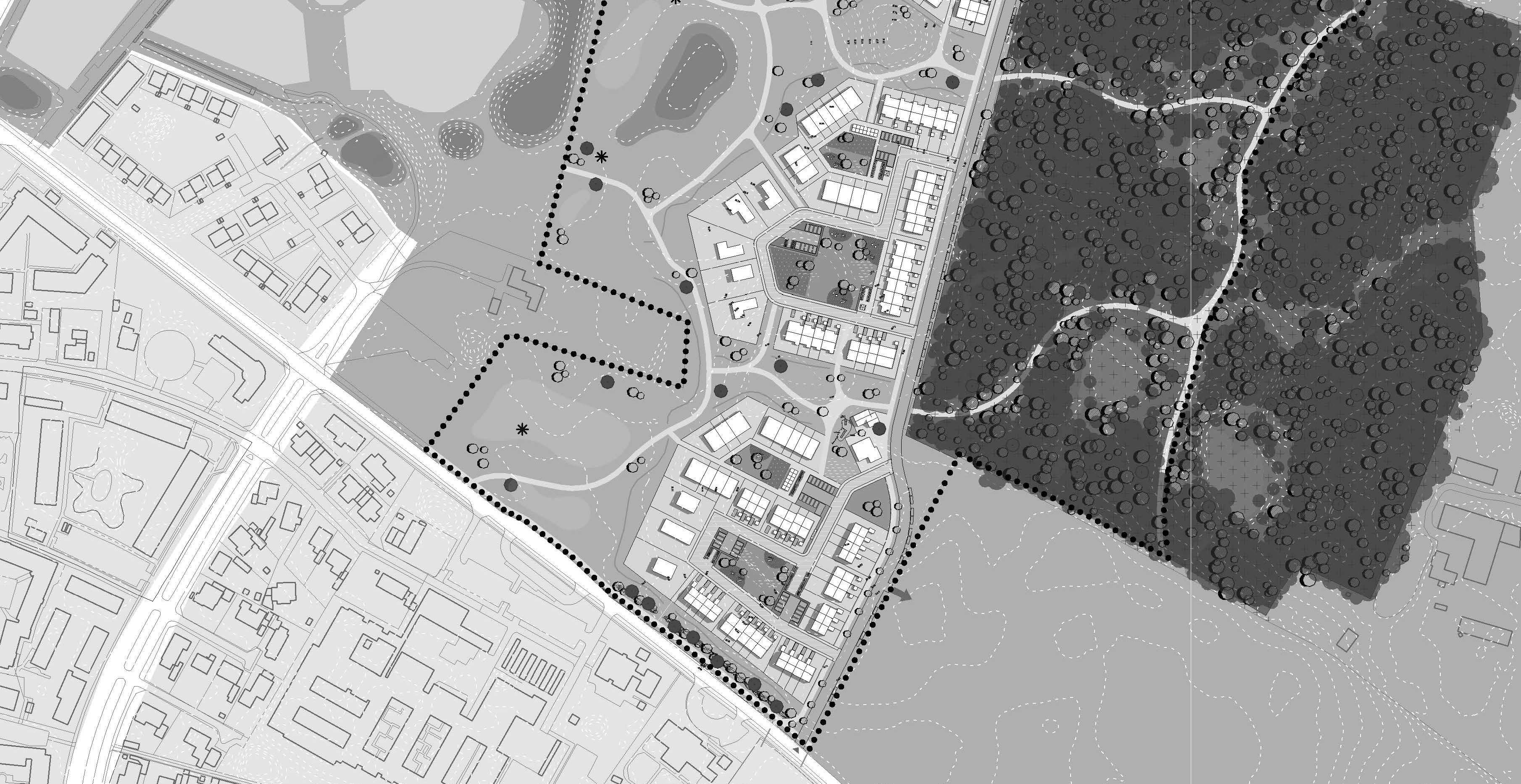 Boligerne er organiseret i klynger omkring indre gårdrum, der rummer fælles opholdsarealer samt parkering. Boligerne opføres i 1-2 etager og skal fremstå med facader tegl og træ. Mod vest grænser boligklyngerne op til Syvmosekilen, der udgør bydelens rekreative blå/grønne rygrad. Syvmosekilen gøres offentlig tilgængelig med nye stier og vil fremtræde med karakter af vildeng med regnvandsbassiner til lokal håndtering af regnvand. Her kan etableres naturprægede fællesfaciliteter som fx shelters, bålhytte, naturlegeplads og lign., der kan understøtte områdets rekreative brug. Øst for boligerne ligger Skousbo Skov, og med lokalplanen sikres offentlig adgang til dele af skoven via nye stier. Skoven forbliver privatejet, og adgang kan reguleres iht. Naturbeskyttelsesloven. Boligerne vejbetjenes af en ny stamvej med tilslutning til Ørstedvej. Stamvejen skal på sigt også betjene fremtidige etaper øst og nord for lokalplanområdet.