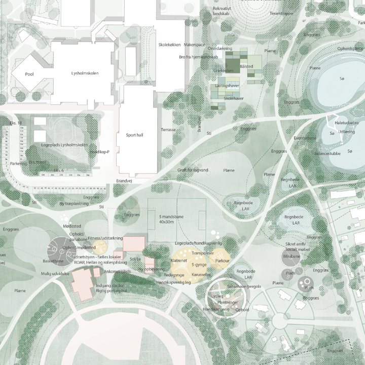 Haveforbindelsen løber syd for Havebyen, hvor "Baghaven" mod øst bindes sammen med "Idrætshaverne" mod vest. Havebyen bliver bydelens nye midtpunkt, hvor sundheds-/kvarterhus, rækkehuse og ældreboliger ligger omkring den nye "haveplads".