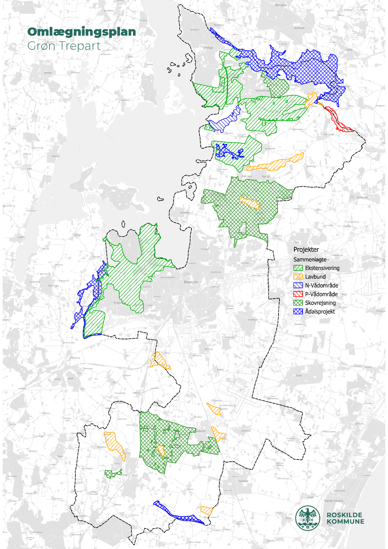 Kommunerne har fået en central rolle i planlægning og implementering af den grønne trepart. I løbet af 2025 har Roskilde Kommune, som en del af de lokale treparter, udarbejdet en arealomlægningsplan. Planen viser, hvor man i de kommende år skal etablere vådområder og minivådområder, udtage lavbundsarealer, ekstensivere, rejse skov samt opnå større sammenhængende naturområder.