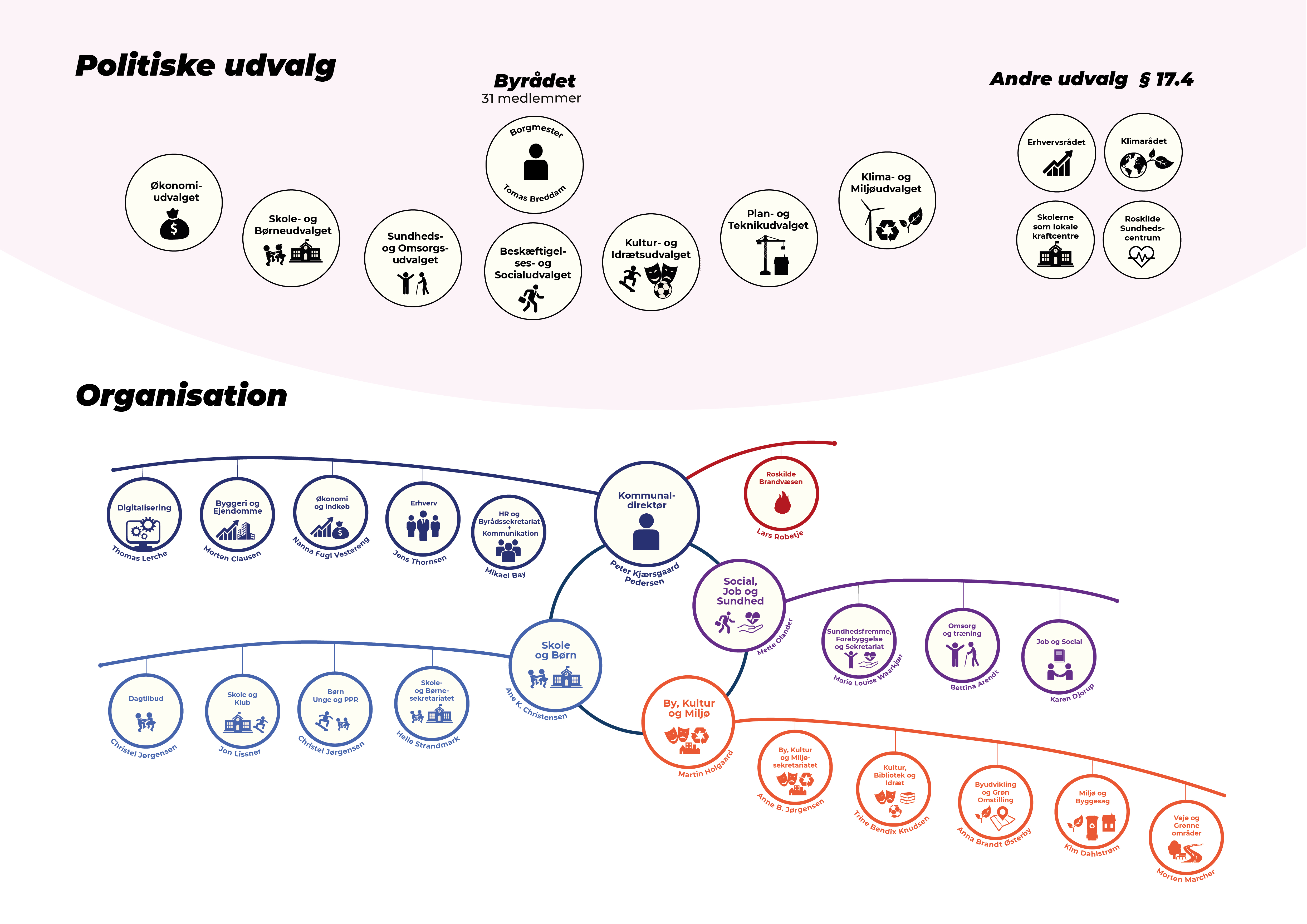 Her kan du få et overblik over, hvordan Roskilde Kommune er opbygget organisatorisk.
