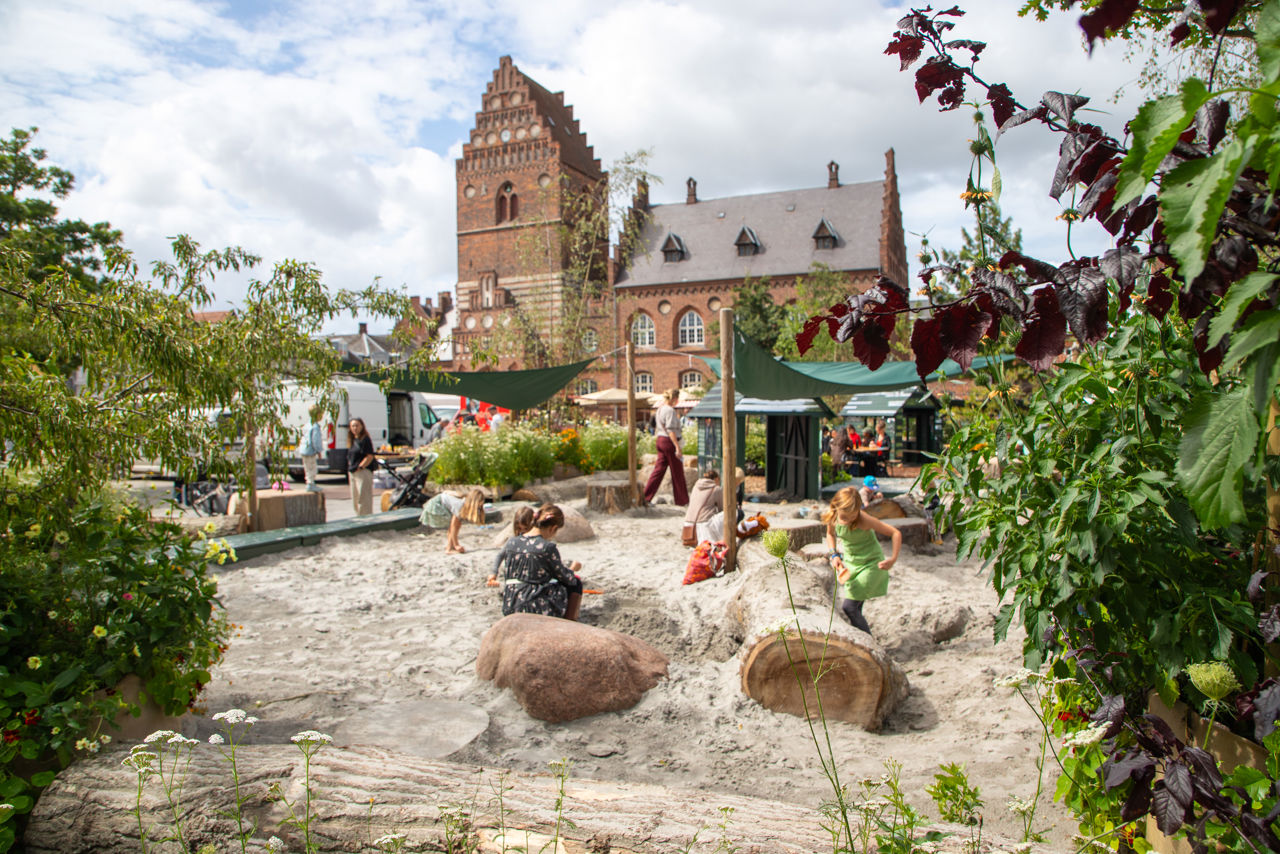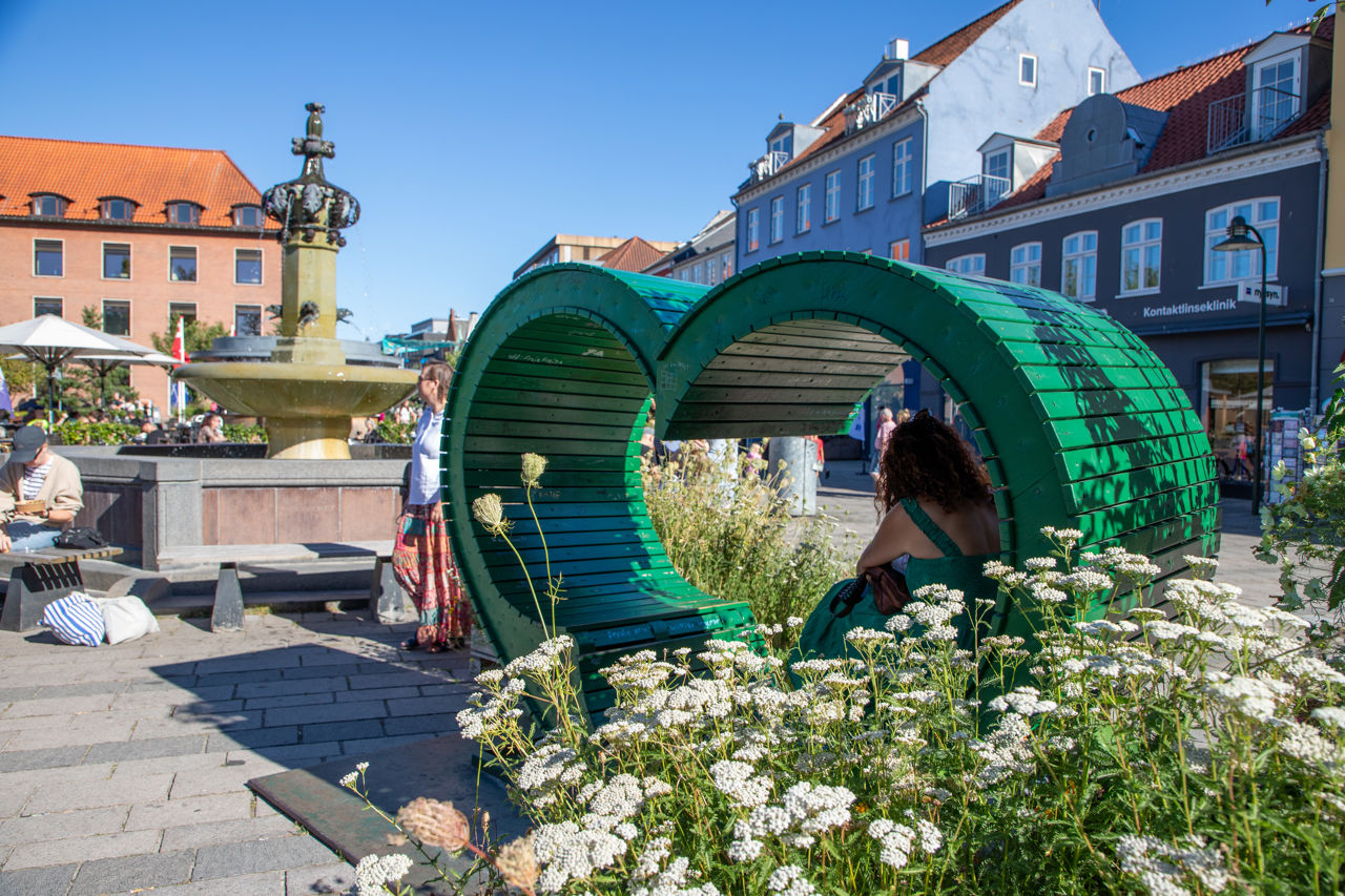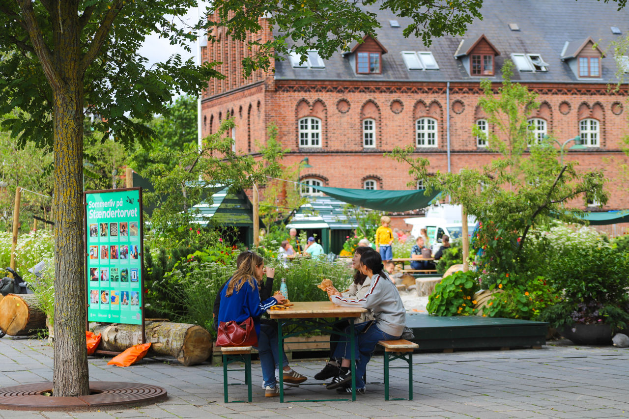 På Stændertorvet indrettes der i juli og august 2025 et grønt centrum, som med blomsterengmåtter, buske, træer, flisbelægning og lyskæder skaber et sommerbyrum med plads til det daglige liv.