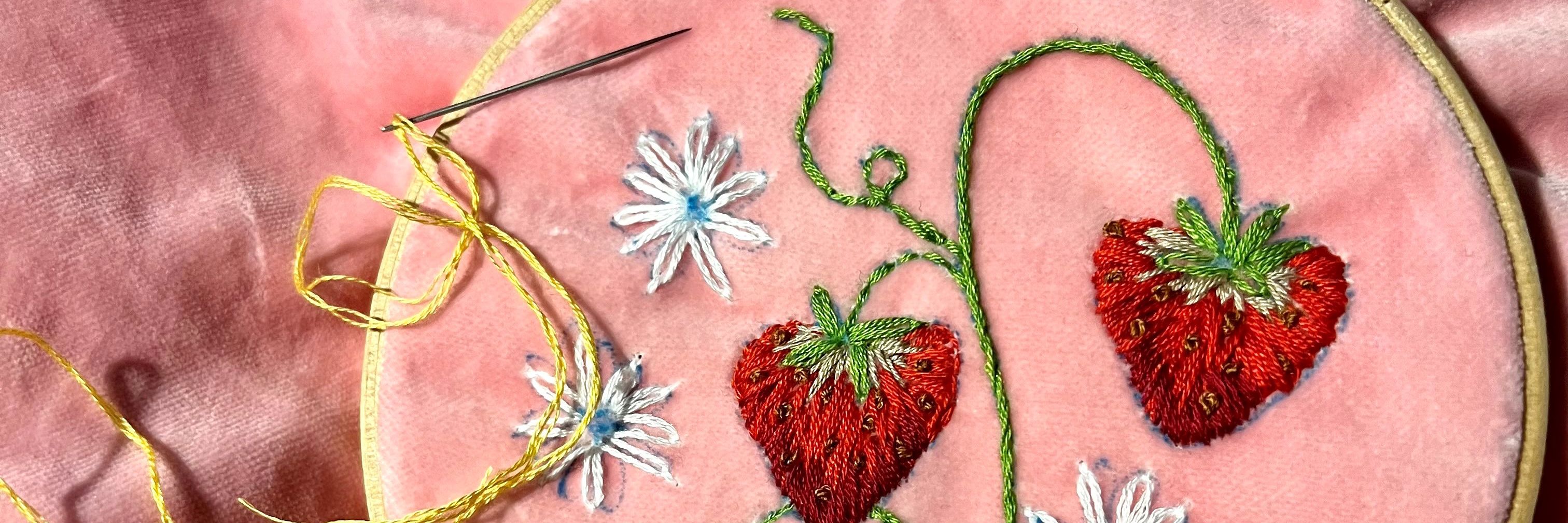 På hendes sofa lyser et sytøj med spraglede perler op. Broderi er en håndarbejdsgren, hun for nylig har kastet sig over. Louise Kildegaard Lindstrøm viser to broderede tasker frem: Én med romantiske skovjordbær og én med et kækt hummermotiv.