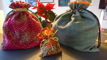 ”Jeg syr gaveposer af stofrester, jeg har til overs fra andre af mine syprojekter. Eller af stof, jeg køber i genbrugsbutikker. I januar kan man her tit finde duge eller gardiner med fine julemotiver til nedsat pris.