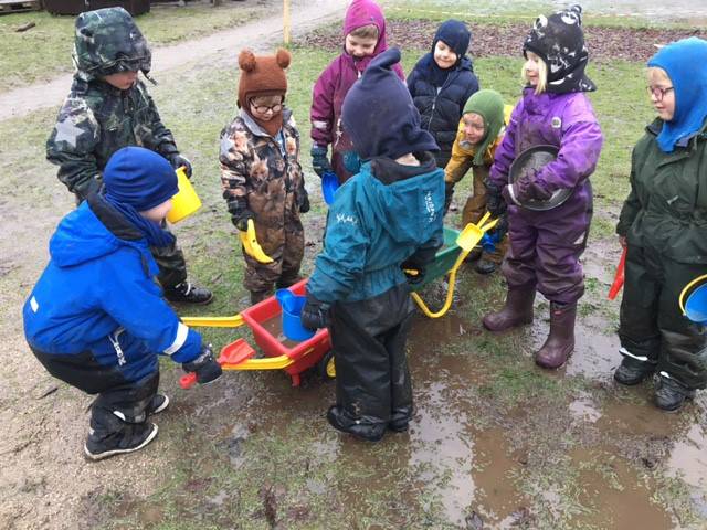 Vi vægter stor brug af uderummet og har indrettet værksted på legepladsen, hvor børnene kan tilgå kreative materialer og være skabende. Vi har et bålhus og køkkenhaver og høster gerne sammen med børnene, så de ser processen fra jord til bord. Vi er ved at skabe et stykke eng på plænen, for at lære børn om biodiversitet.